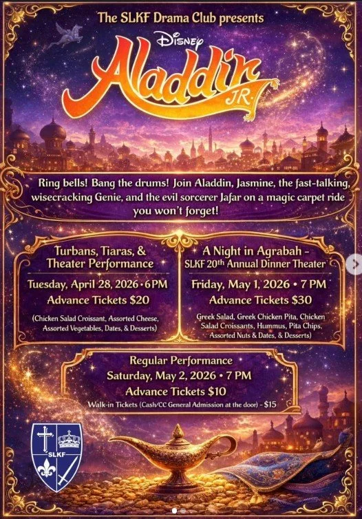 Ring the bells! Bang the drums! Join Aladdin, Jasmine, the fast talking, wisecracking Genie, and the evil sorcerer Jafar on a magic carpet ride you won’t forget! Don’t miss this amazing production by our SLKF Drama Club!
